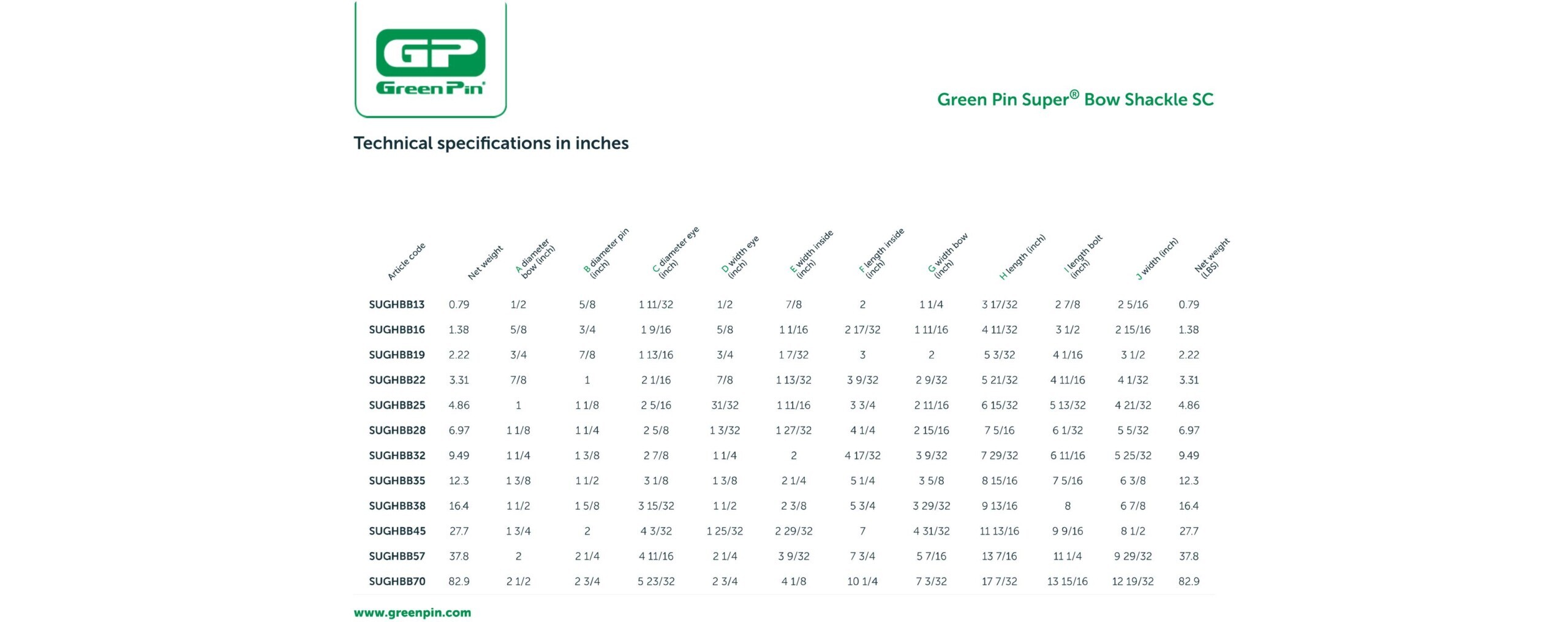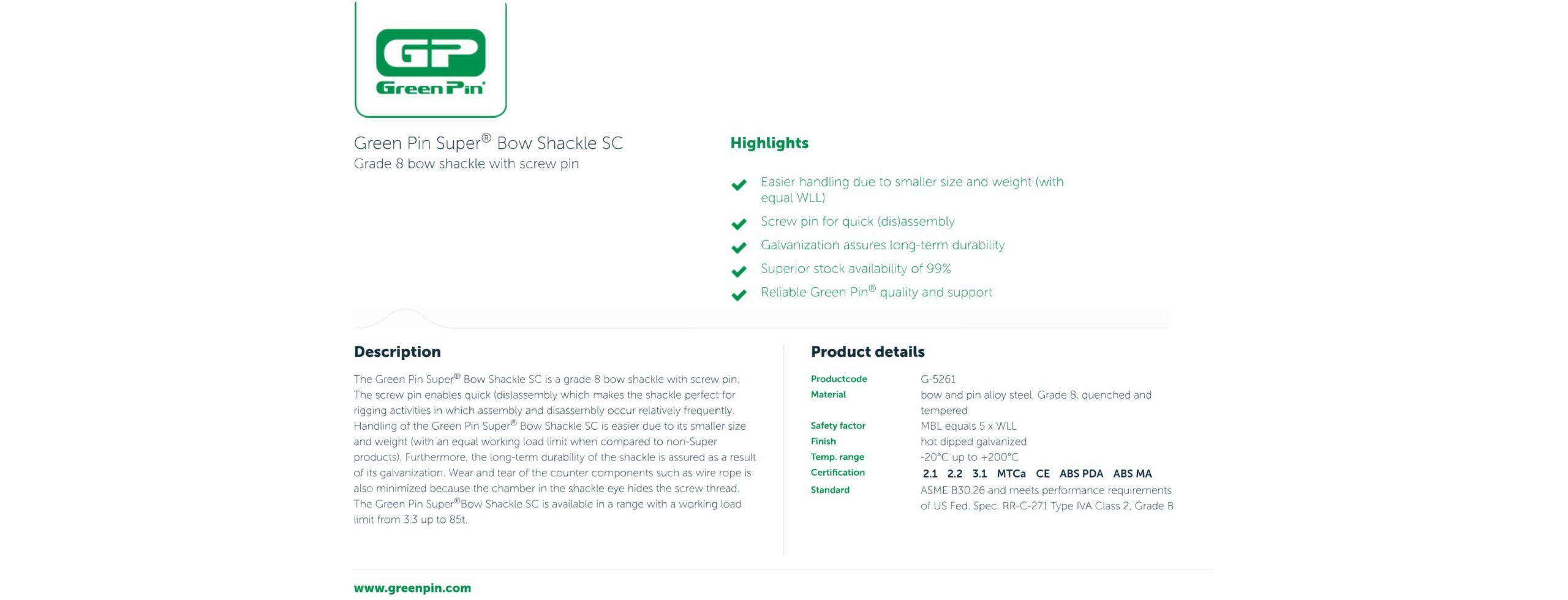 - The Green Pin Super® Bow Shackle SC is a grade 8 bow shackle with screw pin. The screw pin enables quick (dis)assembly which makes the shackle perfect for rigging activities in which assembly and disassembly occur relatively frequently. Handling of the Green Pin Super® Bow Shackle SC is easier due to its smaller size and weight (with an equal working load limit when compared to non-Super products). Furthermore, the long-term durability of the shackle is assured as a result of its galvanization. Wear and tear of the counter components such as wire rope is also minimized because the chamber in the shackle eye hides the screw thread. The Green Pin Super®Bow Shackle SC is available in a range with a working load limit from 3.3 up to 85t.